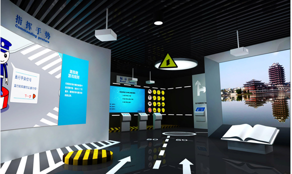 交通安全教育科普館由交通安全VR、交通標識識別游戲、放學路上、VR眼鏡模擬醉駕、模擬交通指揮臺、交通安全實踐體驗、交通安全機器人、交通標志連連看、安全氣囊、交通信號燈、酒駕的危害、斑馬線的作用、虛擬自行車、正確使用安全帶、道路安全常識、酒精含量觀測、公交逃生演練、交通安全三字歌、乘車安全、闖紅燈危害體驗、交警手勢互動模擬和交通安全科普知識展板等組成。