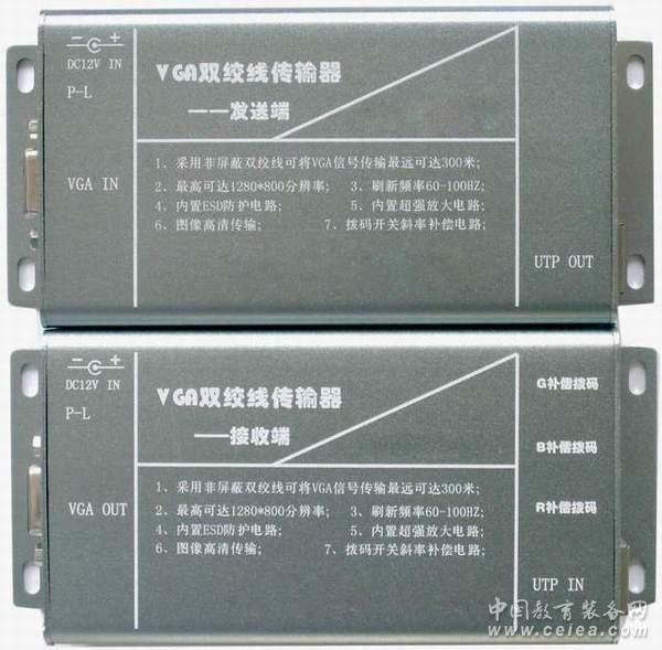 產(chǎn)品詳細(xì)介紹VGA雙絞線傳輸器(Kylines VGA300),VGA延長器,VGA收發(fā)器,VGA長線驅(qū)動(dòng)器,VGA放大器 一、產(chǎn)品概述: 為了解決VGA信號(hào)+音頻信號(hào)較長距離的傳輸時(shí),發(fā)生的圖像重影,顏色失真等問題,北京麒麟視訊科技有限公司研發(fā)生產(chǎn)了這款雙絞線VGA傳輸器,可以傳輸距離為0--300米,是專為網(wǎng)絡(luò)平板顯示及大屏幕幕墻顯示廣告工程、工業(yè)自動(dòng)化控制、醫(yī)療設(shè)備、安防監(jiān)控、多媒體教學(xué)等顯示系統(tǒng)工程中高質(zhì)量VGA視頻信號(hào)長距離傳輸?shù)男枨蠖鴮I(yè)設(shè)計(jì)的集VGA信號(hào)轉(zhuǎn)換、分配、驅(qū)動(dòng)、接收和還原功能為一身的信號(hào)傳輸系統(tǒng)。它可以將VGA信號(hào)通過非屏蔽五類網(wǎng)線上平衡傳輸,以增強(qiáng)對(duì)共模噪聲及干擾信號(hào)的抑制,同時(shí)大幅度地節(jié)約線材成本并簡化了工程布線。采用專利技術(shù)將H和V信號(hào)編碼至RGB信號(hào)上加重處理后發(fā)送,僅利用CAT-5電纜的三對(duì)雙絞線完成VGA、SVGA、SXGA、XGA、SXGA的RGBHV信號(hào)的平衡編解碼,并采用遠(yuǎn)距離高頻補(bǔ)償加重處理,帶寬高達(dá)350MHz。使XGA(最高1600*900/60Hz)的傳輸距離達(dá)到300米,以滿足大型工程投影機(jī)、顯示器、TFT-LCD TV、PDP信號(hào)傳輸?shù)男枰S捎谡麄(gè)傳輸系統(tǒng)采用了加權(quán)零值拆分的平衡傳輸?shù)膶@夹g(shù),因此雙絞線在傳輸信號(hào)時(shí)不會(huì)對(duì)外造成EMI的干擾。可通過設(shè)置撥碼開關(guān)來調(diào)整傳輸距離的遠(yuǎn)近。