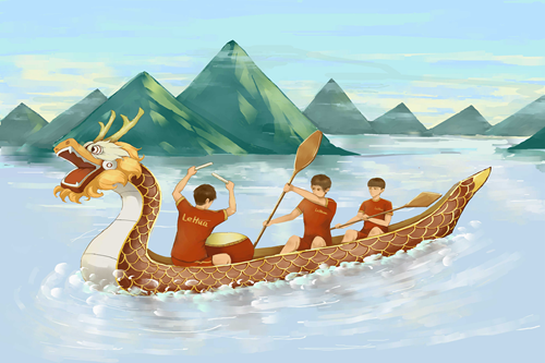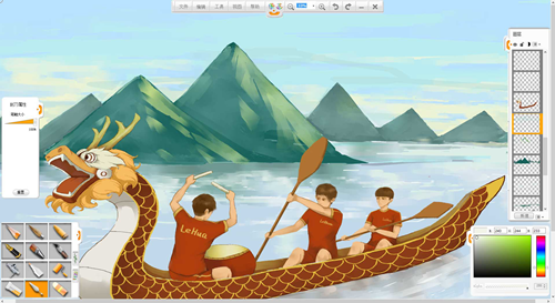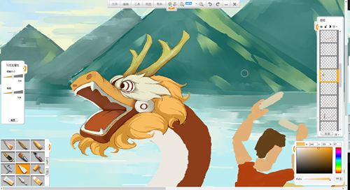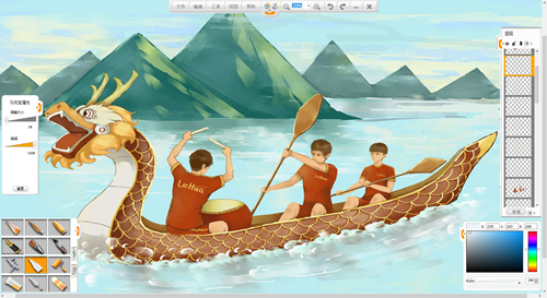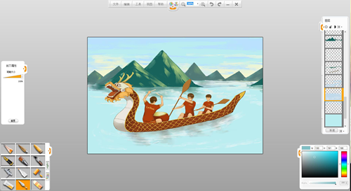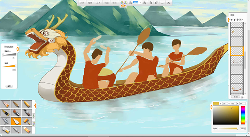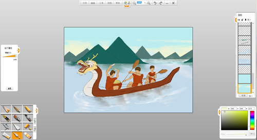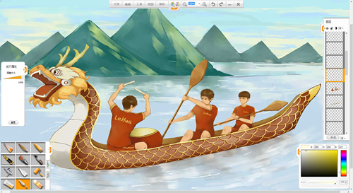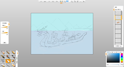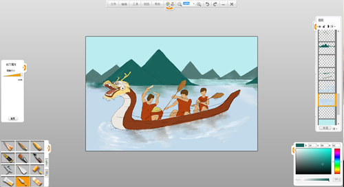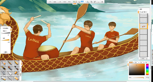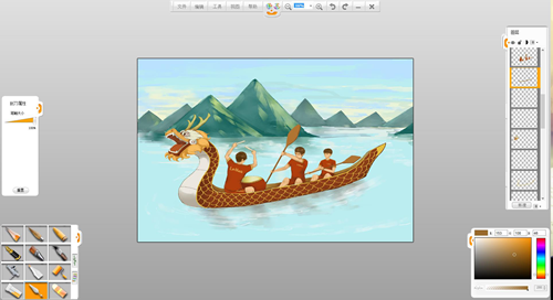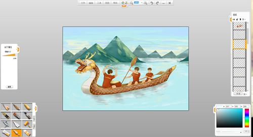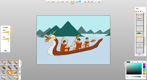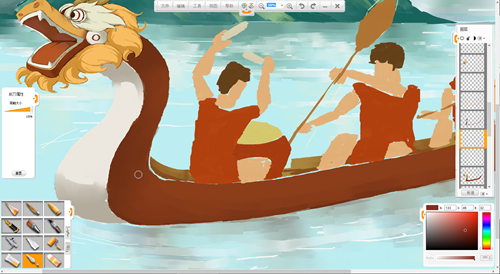 7.用馬克筆筆觸,選擇自己認為適當的顏色,為人物和龍舟涂上顏色。