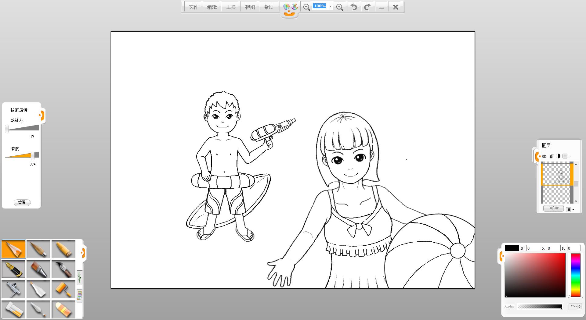 4.使用鉛筆筆觸繪制一個拿水槍的泳裝男孩形象。