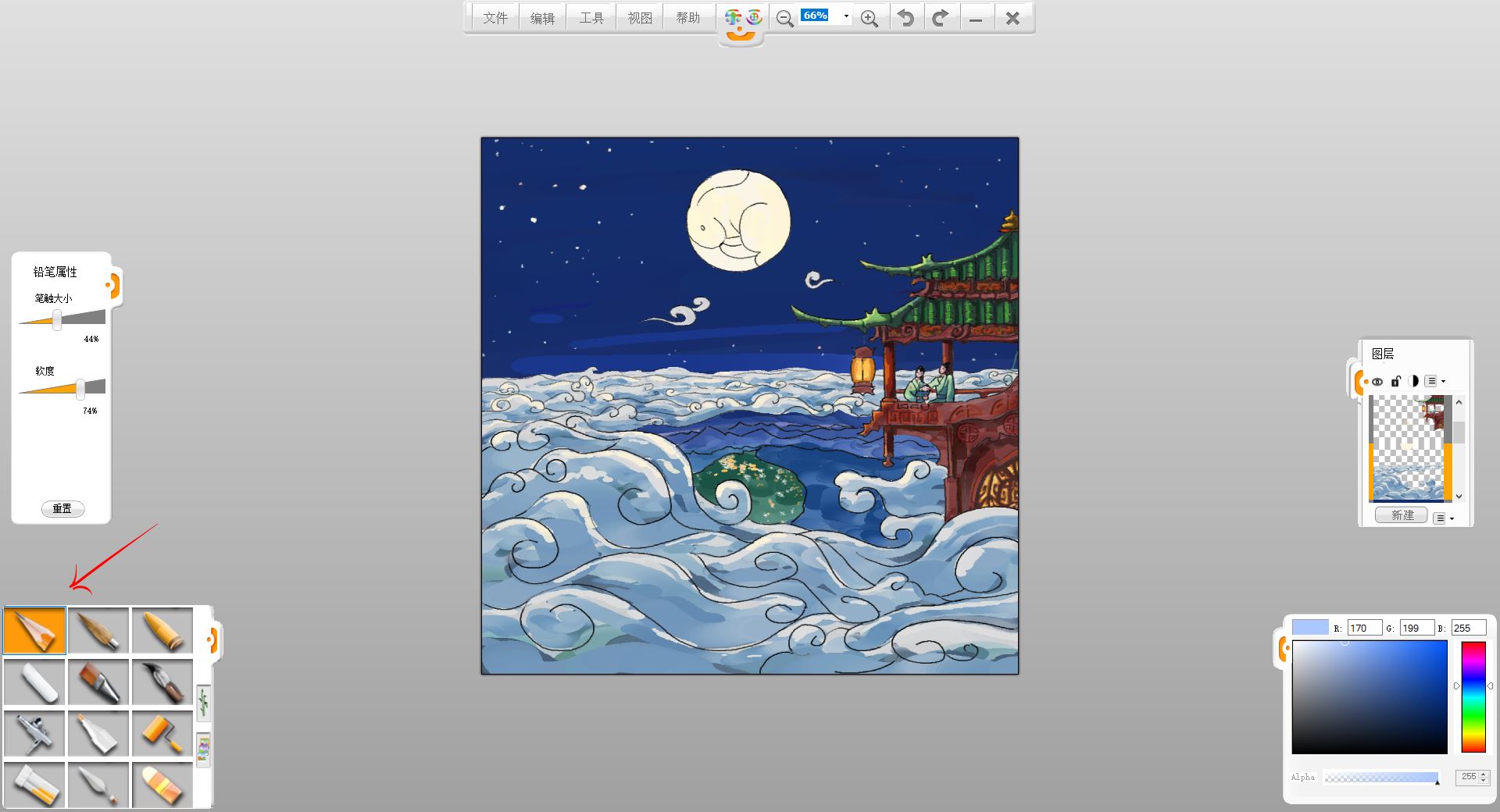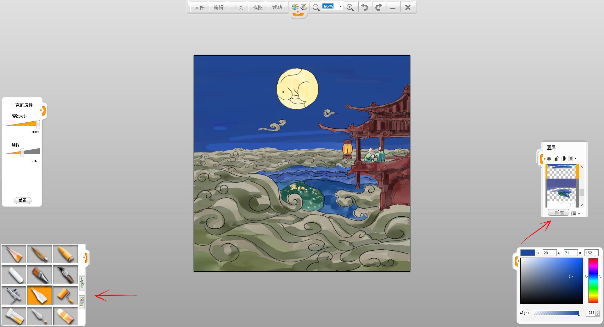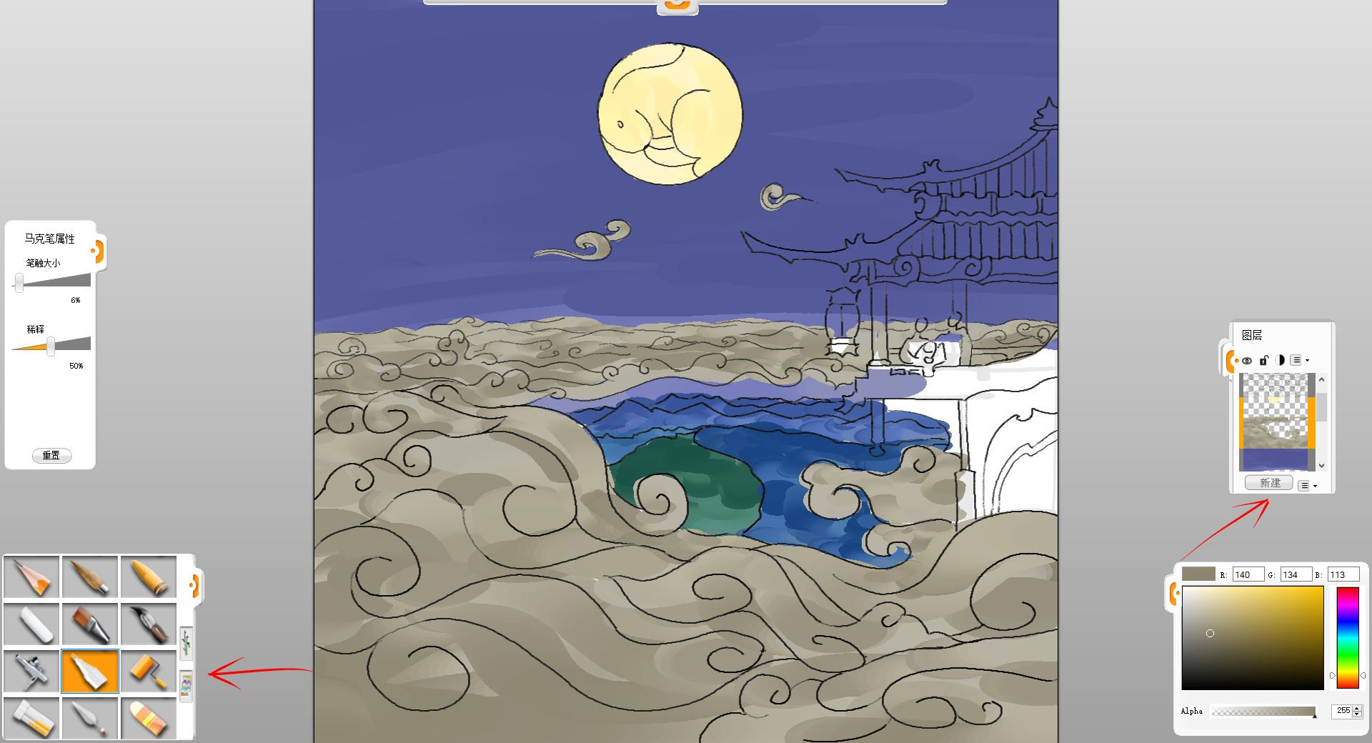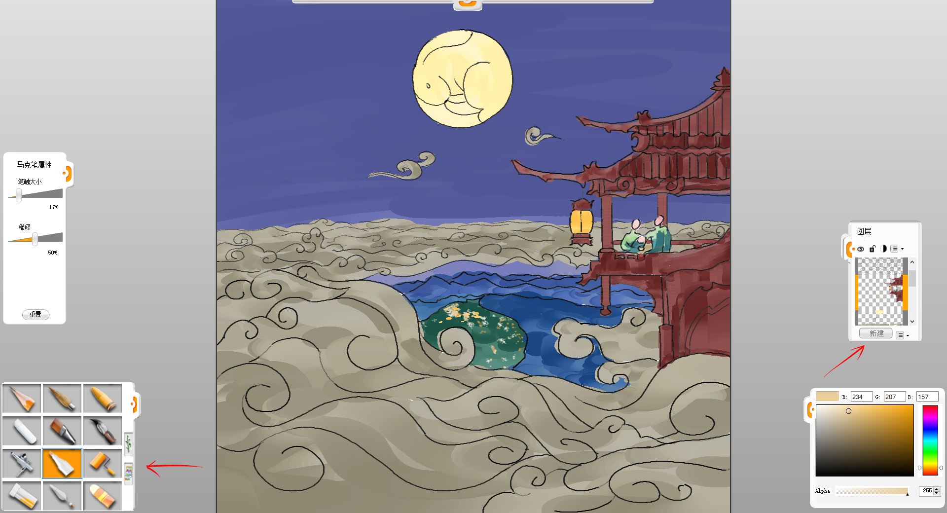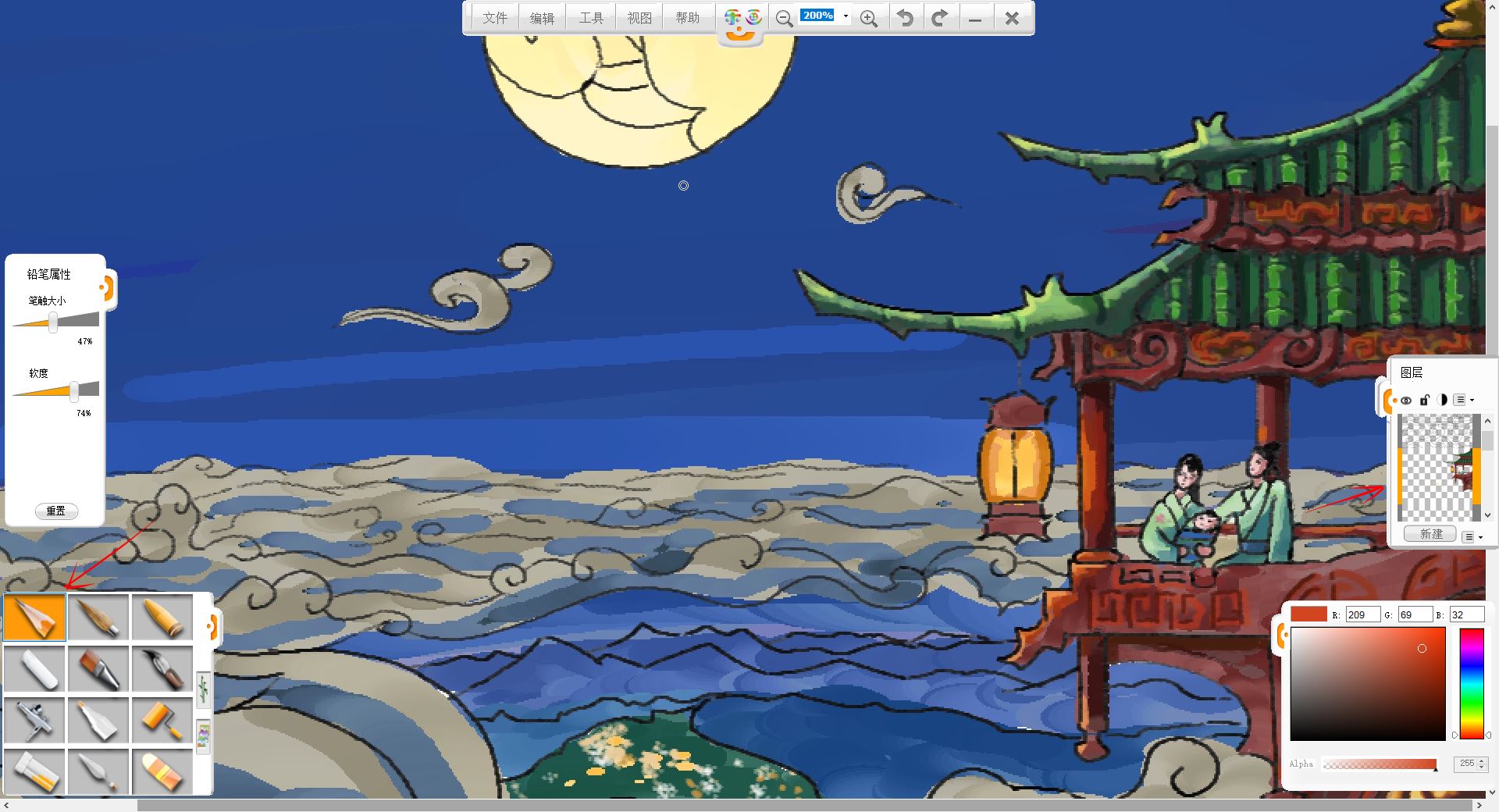 10.新建一個圖層,用馬克筆筆觸給小樓和賞月的一家三口簡單鋪色。