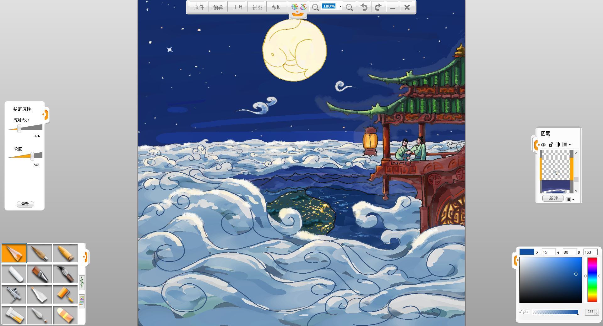 19. 最后潤色調整些細節,擦掉一些邊邊角角沒畫好的,這樣一幅中秋瓊宇賞月圖就完成了。