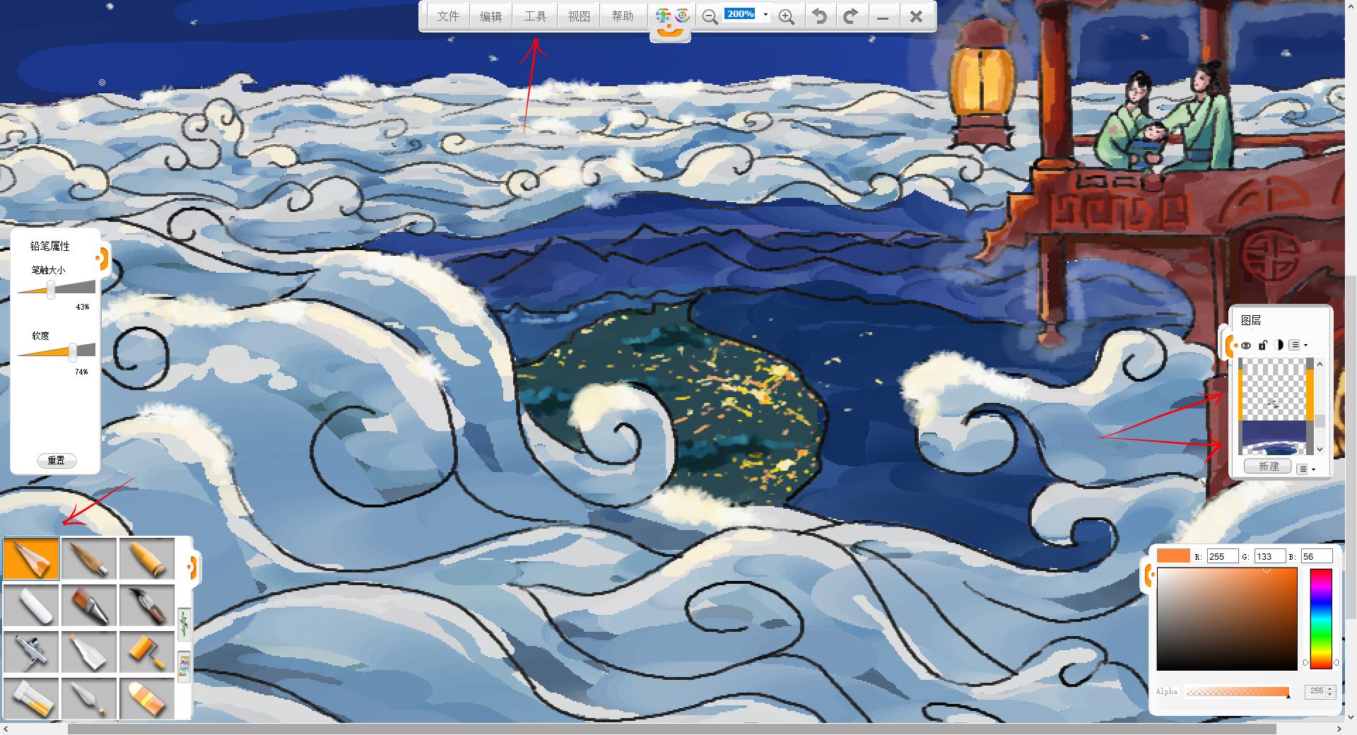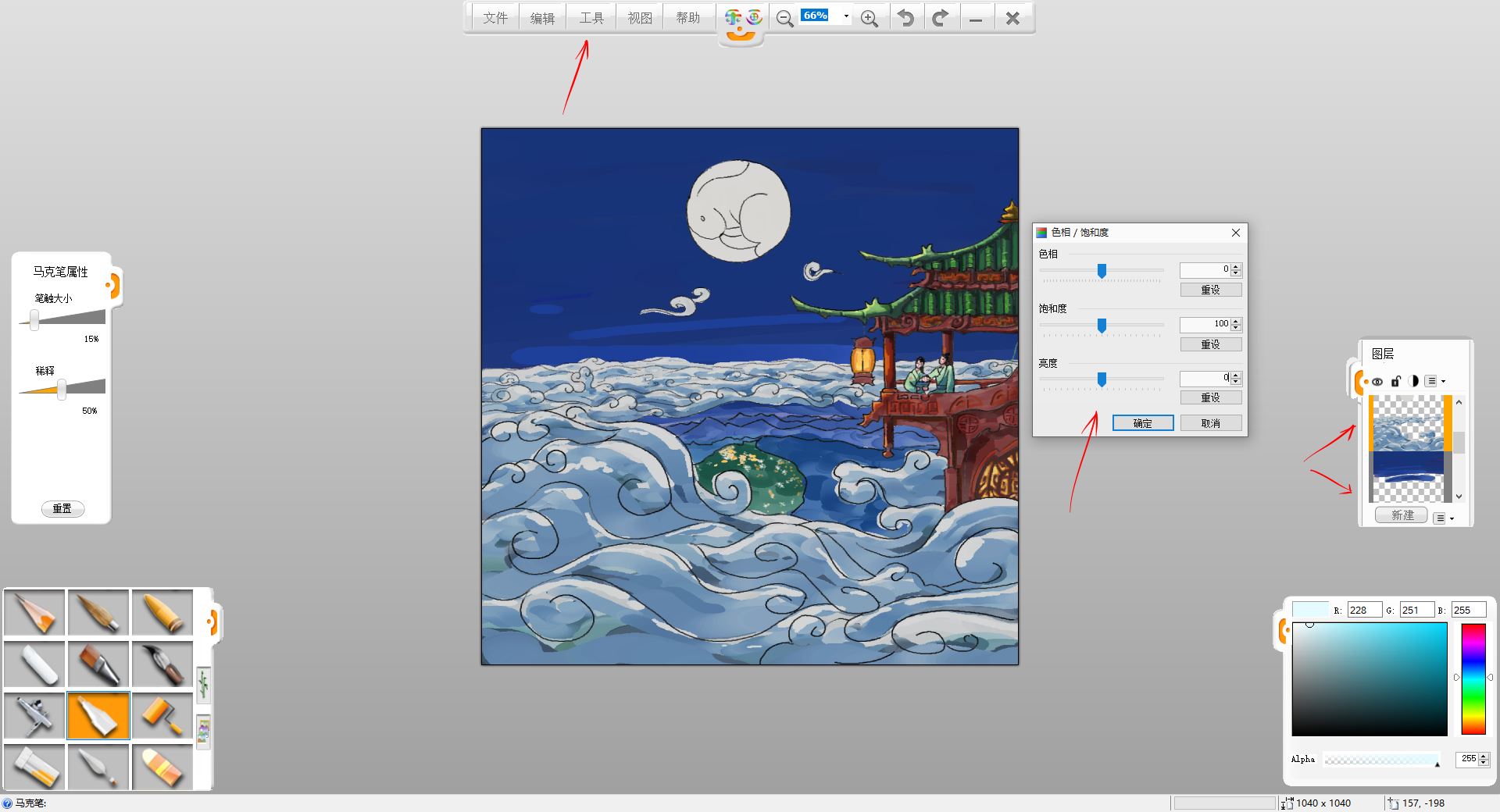 12.用“工具”-“調整”-“色相/飽和度”調整工具,調整云暗面圖層的色相,使其更符合環境色。然后合并樓宇,人物圖層,使用鉛筆工具,刻畫建筑圖案和陰影等細節,對著月亮和燈籠的一面偏亮,背著的一面偏暗,線稿也可以稍作調整。