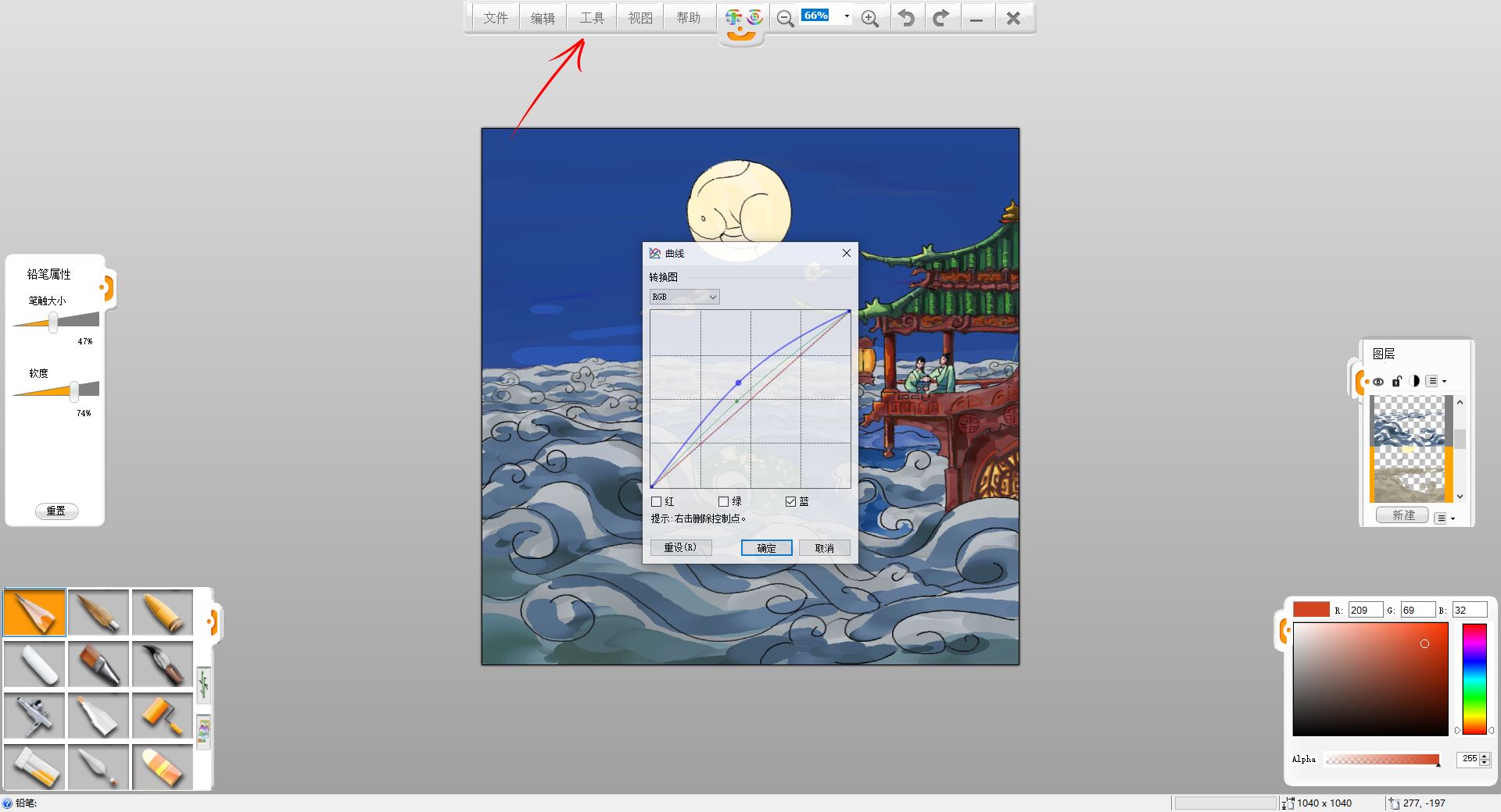 13.使用“工具”-“調整”-“曲線”調整工具,給云層調色,之前偏綠,而夜晚的云層應該偏藍色,選中云層圖層,這里可以用曲線調整工具調整亮度和色相。