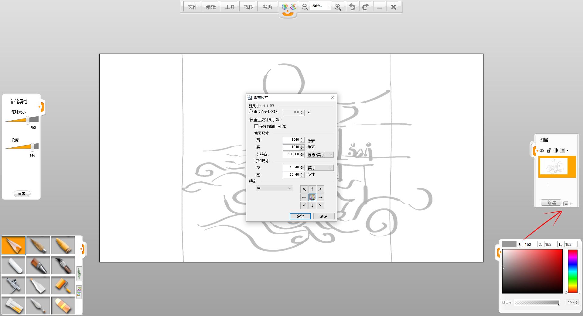 4.點擊箭頭所指功能模塊,選擇重新設置畫布尺寸,估算好草稿的外輪廓范圍,在彈出欄修改畫布參數,設置為一塊正方形畫卷。