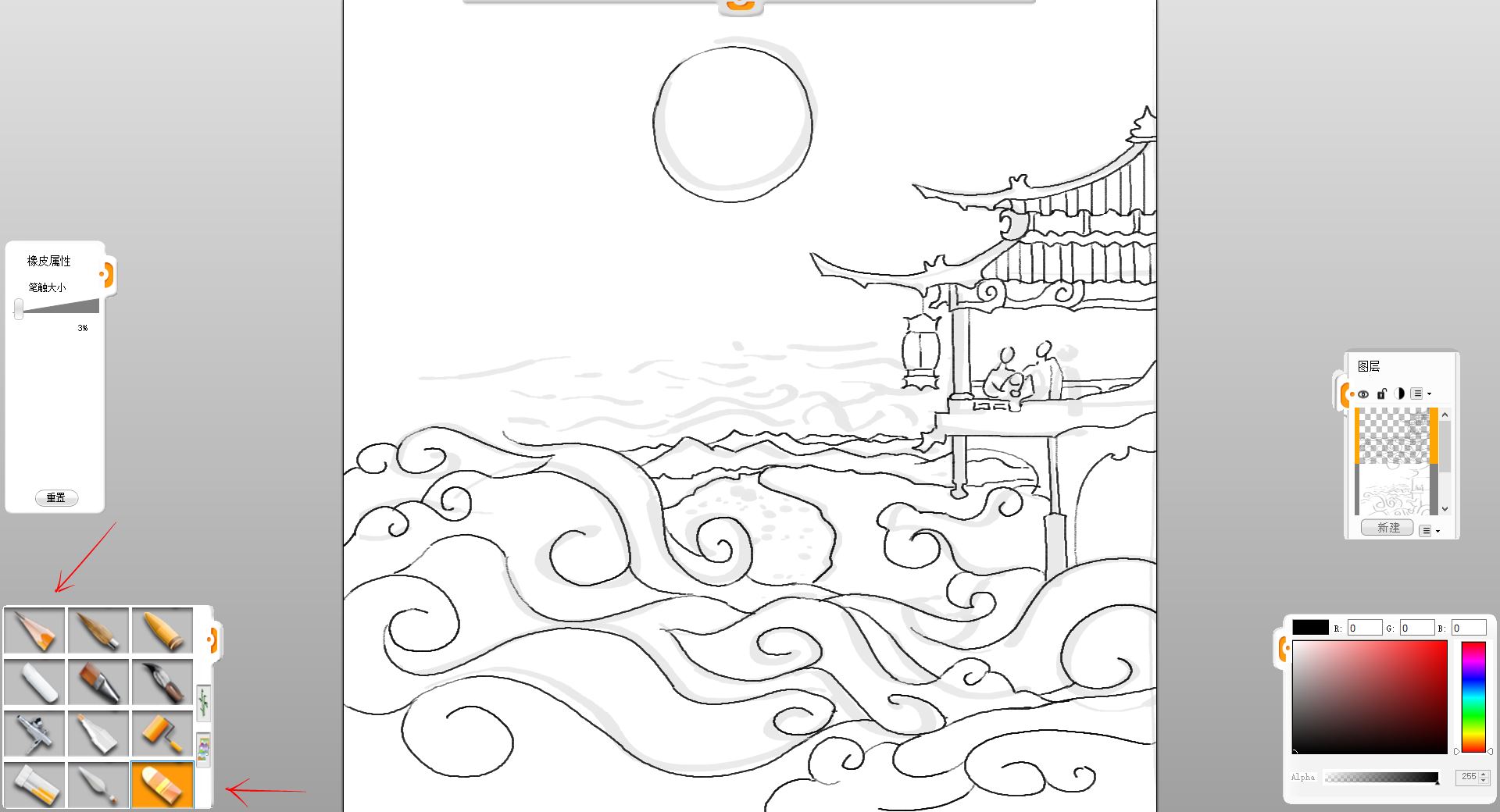 6.用鉛筆筆觸繪制閣樓、人物、近處祥云的和云下小城的輪廓,配合橡皮擦筆觸修改。
