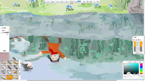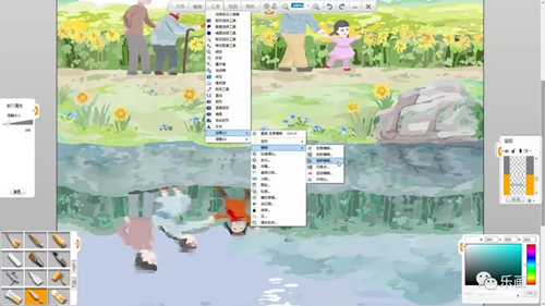 14 注意和上方草木不同的是,下方的倒影是在水中,水面有波紋,不是完全的鏡面,所以草木是斷斷續(xù)續(xù)、不是連續(xù)的,這里可以用刮刀工具補(bǔ)充處理