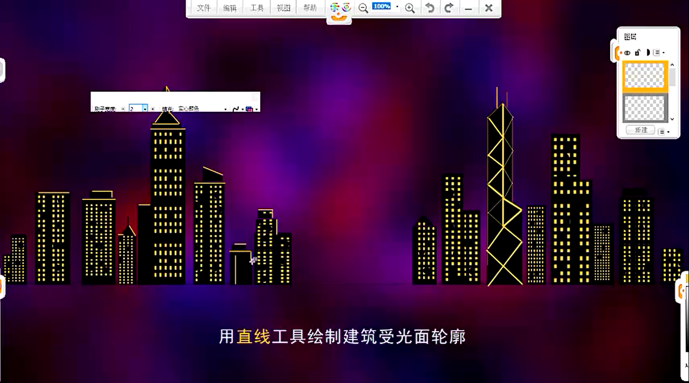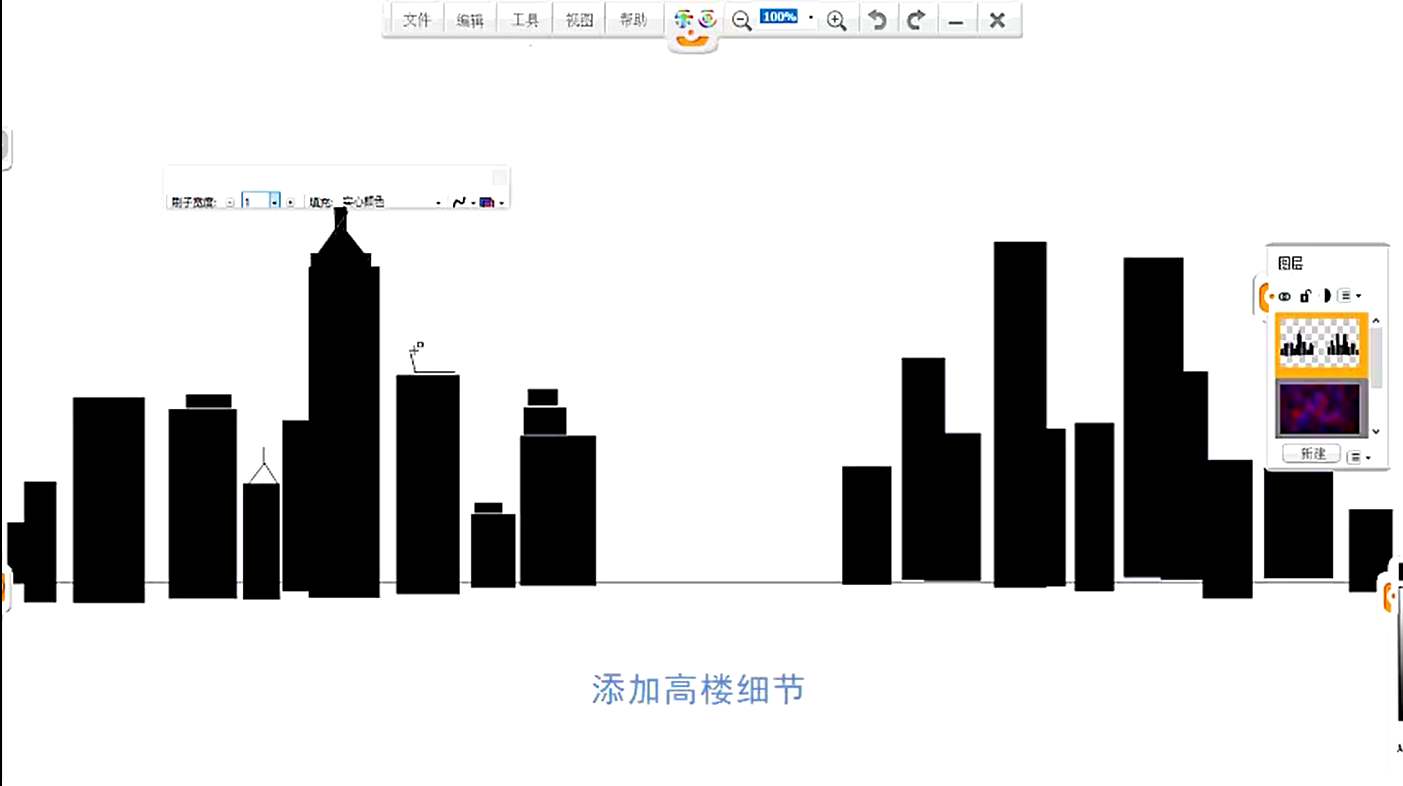 10、繼續使用直線和矩形工具,為高樓天界頂端細節等