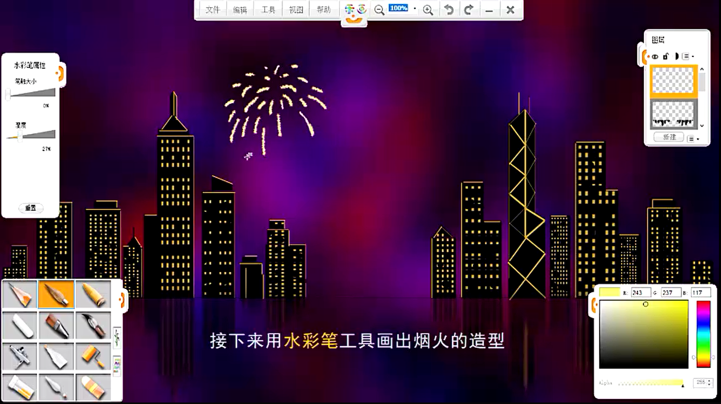 20、接下來,選擇不同色彩的水彩筆筆觸,繪制夜空中的煙花