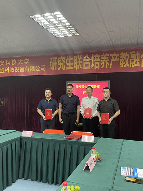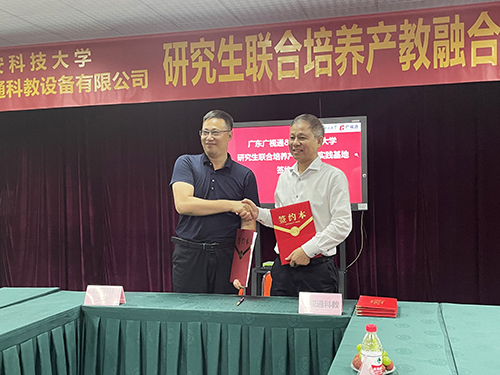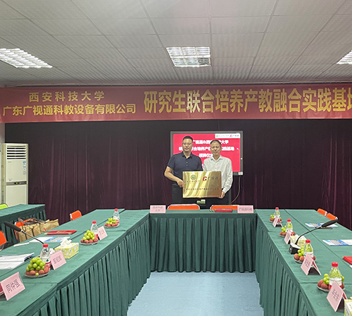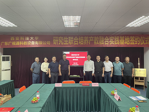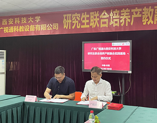 2023年7月8日下午,廣東廣視通科教設(shè)備有限公司與西安科技大學“研究生聯(lián)合培養(yǎng)產(chǎn)教融合實踐基地”簽約儀式在廣視通大廈二樓會議室舉行。西安科技大學管理學院副院長鄒紹輝,西安科技大學大灣區(qū)研究生聯(lián)合培養(yǎng)產(chǎn)教融合實踐基地導(dǎo)師羅立升,西安科技大學大灣區(qū)MBA校友會籌備組秘書長、東莞市市場監(jiān)督管理局石排分局同仲強,大灣區(qū)西安科技大學MBA校友會籌備組委員陳桂;特邀嘉賓廣東科技學院黨委副書記、副校長畢會東,東莞市名校研究生培育發(fā)展中心林洪嘉;公司董事長陳登貴、副總經(jīng)理吳斌華、副總經(jīng)理潘富兵等出席簽約儀式。由西安科技大學大灣區(qū)研究生聯(lián)合培養(yǎng)產(chǎn)教融合實踐基地導(dǎo)師羅立升主持簽約活動。