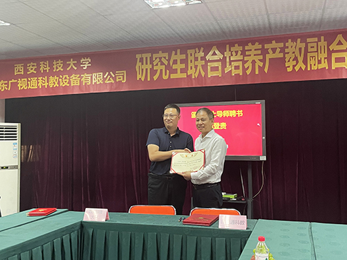 座談會結(jié)束后,西安科技大學管理學院副院長鄒紹輝、廣東廣視通科教設(shè)備有限公司董事長陳登貴分別代表雙方簽訂共建“研究生聯(lián)合培養(yǎng)產(chǎn)教融合實踐基地”合作協(xié)議并進行授牌,鄒紹輝副院長為陳登貴董事長及實踐基地建設(shè)團隊導(dǎo)師頒發(fā)校外碩士導(dǎo)師聘書。