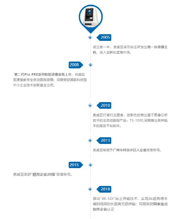 2005年,成立第一年,奧威亞成功自主研發(fā)出第一臺(tái)錄播主機(jī),進(jìn)入全新的藍(lán)海市場(chǎng)。
