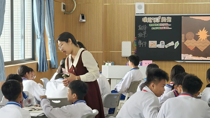 在揭陽會場,數學種子教師蔡曉凝老師的課例《生活中的比》以參觀惠來縣大南山革命根據地為情境導入,將數學學習與家鄉文化、革命精神傳承緊密相連,積極探索了數學與美術、歷史等學科的融合路徑,培養了學生的跨學科思維。同時,蔡老師借助AI智能體與學生進行現場對話,為學生答疑解惑,幫助學生更快、更準確地理解“比”的意義。