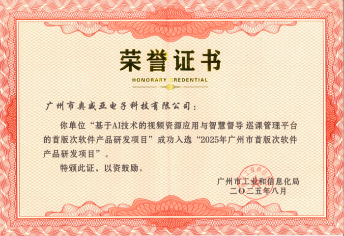 日前,國新文化所屬奧威亞公司“基于AI技術(shù)的視頻資源應(yīng)用與智慧督導(dǎo)巡課管理平臺(tái)”入選2025年廣州市首版次軟件產(chǎn)品研發(fā)項(xiàng)目(人工智能和信息安全軟件方向)。