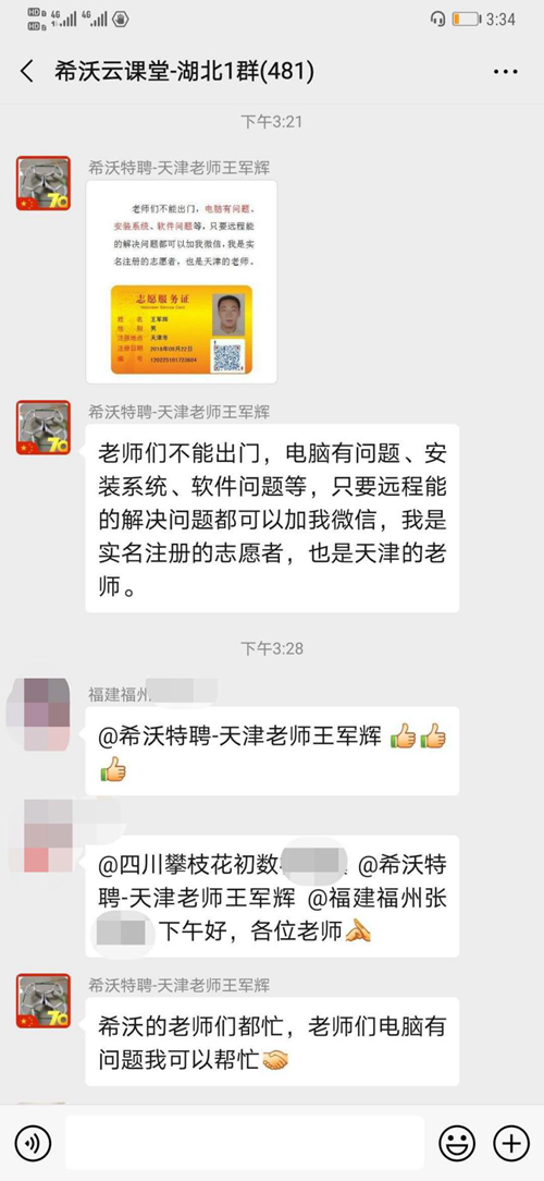 王軍輝老師不僅僅關(guān)心自身學(xué)校的答疑情況,還自愿加入湖北云課堂答疑微信群,幫助湖北老師熟練使用希沃白板云課堂功能,在這個(gè)特殊時(shí)期為湖北的老師們雪中送炭,成為教育戰(zhàn)線上的“最美逆行者”。