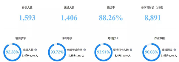 在此次培訓中,培訓內容主要分為交互式課件制作入門訓練營與交互式課堂實戰訓練營兩個方向。參訓的老師們每天按時上線打卡,完成規定的視頻學習任務。此外,老師還需要完成考核小測,以此檢驗學習成果。在完成全部學習任務之后,老師能夠學以致用,能熟練利用希沃白板制作結營課件作品,即視為考核通過。根據后臺統計數據顯示,此次培訓在線最時長達8891小時,參與人數為1593人,培訓通過率為88.26%。