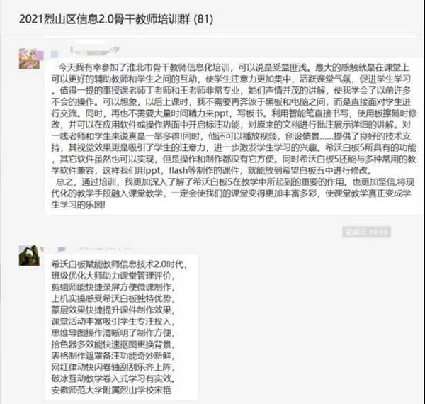 對此次線上培訓,學習群里的老師們紛紛表示受益頗多。其中一位老師在線上反饋道:“在最近幾年的教學中,總感覺傳統課件缺少與學生互動的環節,PPT中的角色設置、素材收集與心目中的預期效果差別很大。今天有幸參加希沃培訓,有醍醐灌頂的感覺,這幾年來的問題和困惑都得到了解決。這個培訓來得太及時了!培訓效果非常好!收獲頗豐!”
