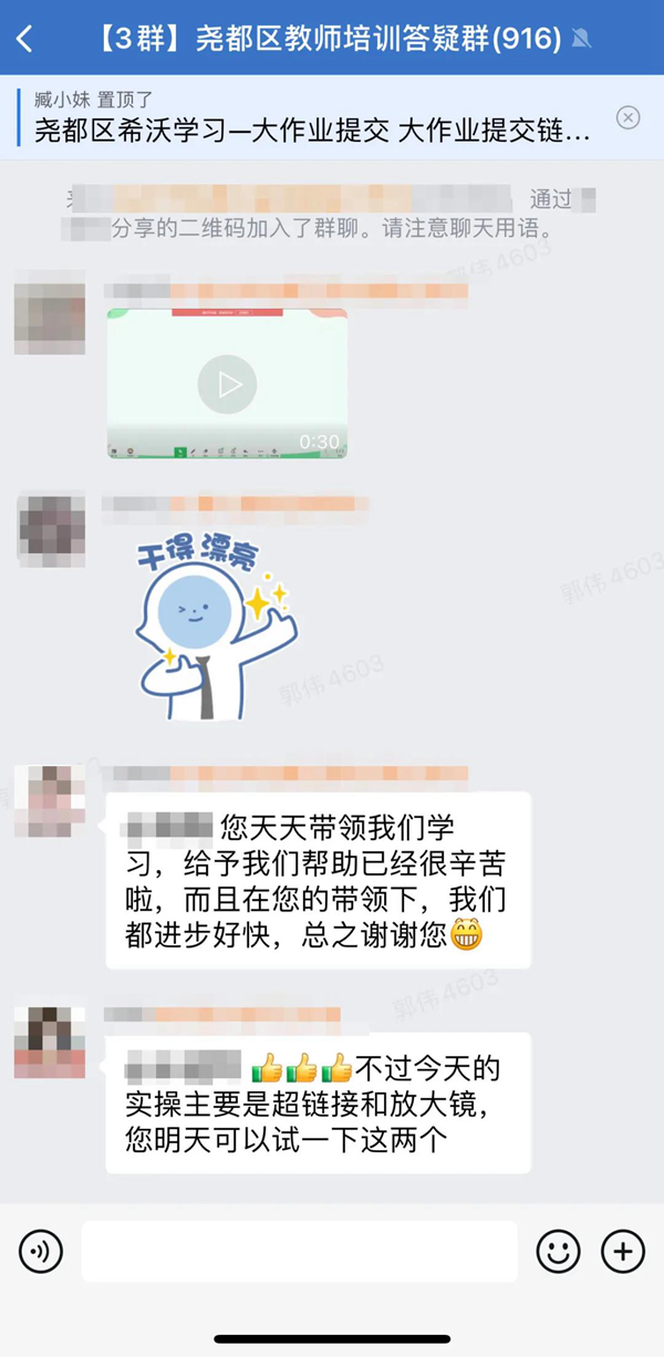 針對本次培訓,堯都區教育局組建了“堯都區教師培訓交流群”,由希沃邀請一線信息技術名師入群進行培訓答疑。一線信息技術名師在群內的互動,進一步點燃老師們的學習熱情,參訓老師紛紛分享自己制作的互動式課件,利用蒙層、課堂獎勵、學科工具、課堂互動等功能變革知識點的各種呈現方式,琢磨功能的刪減……在這個過程中,大家熱烈積極的交流氛圍將培訓推至高潮。