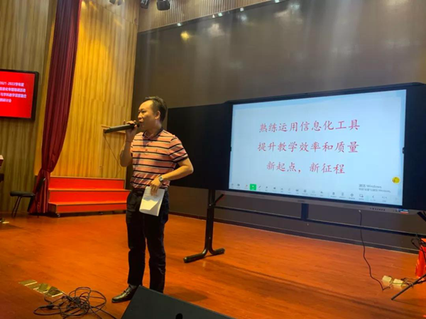 天涯區教育局教研室主任楊得伸上臺發表講話:“當前,教育信息化已經步入加快推進的黃金時期,也進入升級發展的關鍵期。我區堅持‘以信息技術與教育教學深度融合推動教育理念變革、模式再造、體系重構、機制創新’核心理念,聚焦‘智慧教育示范區’建設目標,聚力實施‘天涯區智慧教育建設行動’。在剛結束的線上學習中,我區共計886人通過培訓,整體培訓通過率達到87%,其中16人被評為優秀學員;在此我對以上老師表示衷心的祝賀。今天我們邀請到海口北師大、華二黃流中學、北京外國語附屬的三名教師給我做公開課分享交流活動。希望老師們有所成長、有所收獲。最后,要再次感謝希沃在本次活動中的大力支持。”