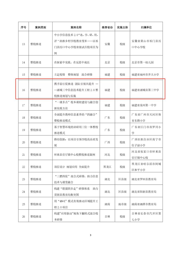 一所山區學校入選全國典型優秀案例校,浦城三中穩步推進。浦城三中以整校推進為發力點,以“領導重視、團隊引領、立足極簡、創新融合”為主旨思想,從“以點帶面,先行先試”、“依托校本,以研促用”、“ 團隊合作,共研共創”、“ 輻射引領,攜手共進”、“ 整校推進,融合創新”五個方面著手,在校本研修、創新融合、團隊成長等方面取得了實效。