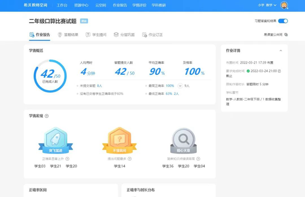 比賽當天,學生通過平板終端接收習題作答并自主提交,完成提交后實時統計學生作答情況,做到精準定位,快速發現并公布“計算小達人”直接晉級到第三關。通過借助希沃平臺精準數據一手掌握學生的作答情況,不僅提升學生口算能力,也考驗學生的心理素質及應變能力。