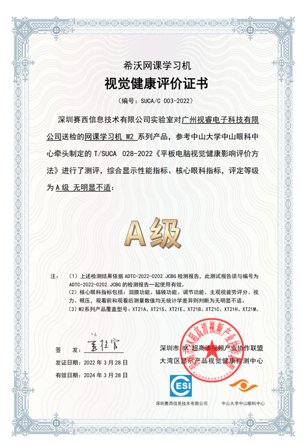 028-2022《平板電腦視覺健康影響評價方法》,經(jīng)過深圳賽西信息技術有限公司實驗室測評,獲得視覺健康影響A級評定,標志希沃網(wǎng)課學習機W2在觀看舒適度上達到了“高標準”的視覺體驗。