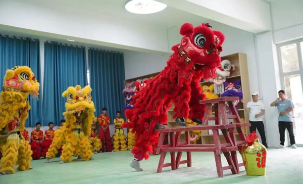 開課儀式現場,疏附縣第一中學舞獅隊的醒獅表演