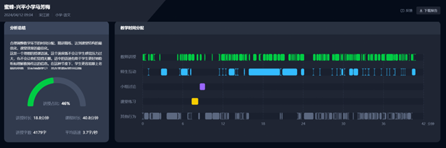 希沃課堂智能反饋系統(tǒng),可以將課堂進(jìn)行結(jié)構(gòu)化分析,對課堂互動環(huán)節(jié)進(jìn)行標(biāo)識,同時通過語音轉(zhuǎn)文本的方式,讓老師可以快速定位到關(guān)注的模塊,對課堂互動、提問設(shè)計進(jìn)行回顧,查看教學(xué)設(shè)計和教學(xué)實施間的差異,明確后續(xù)改善方向。