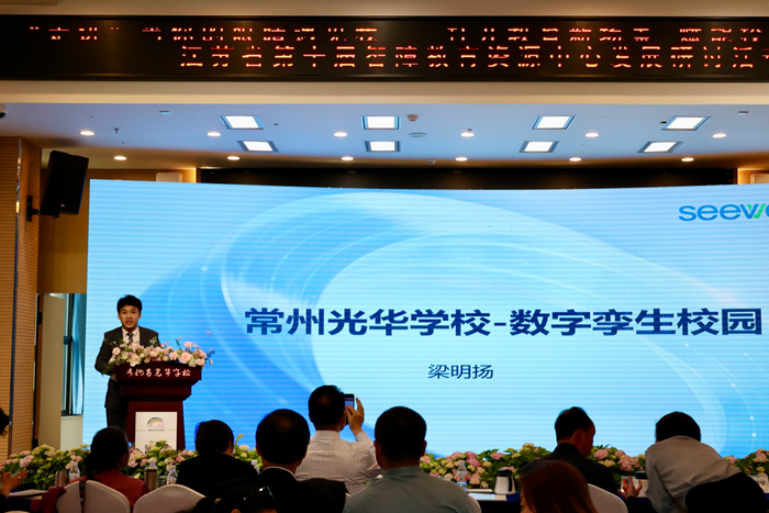 隨著人工智能在教育領域的迅速發展,數字化技術正成為特殊教育領域的一大助力。在活動現場,希沃營銷代表梁明揚向與會嘉賓介紹了希沃為常州市光華學校提供的數字孿生校園方案。