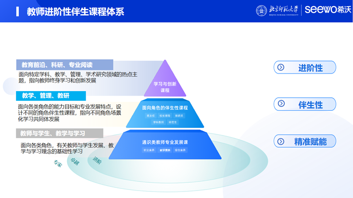 歷經(jīng)半年合作,希沃與北京師范大學(xué)李玉順教授團(tuán)隊(duì)扎根面向全國的教育實(shí)踐,開展數(shù)字化環(huán)境下的教師專業(yè)發(fā)展模式創(chuàng)新研究,提出以變革性學(xué)習(xí)理論創(chuàng)新教師專業(yè)發(fā)展模式,建構(gòu)數(shù)智化環(huán)境下“跨域協(xié)同、行動(dòng)伴生、場景融合、精準(zhǔn)賦能”特征的變革性教師專業(yè)發(fā)展體系,并獲階段性成果:第一、構(gòu)建線上變革性教師專業(yè)發(fā)展體系,以創(chuàng)新為引擎,以覆蓋城鄉(xiāng)之間教師專業(yè)新質(zhì)發(fā)展為目標(biāo),力求促進(jìn)教師“進(jìn)階性伴生發(fā)展”,提升“三新”改革進(jìn)程下教師素養(yǎng)成長型課堂發(fā)展實(shí)踐能力。該體系打破傳統(tǒng)教師發(fā)展存在的瓶頸,針對真需求為教師提供行動(dòng)伴生、情景化、個(gè)性化的服務(wù)。第二、提出區(qū)域智能化新型教師研修模式,通過區(qū)域教師研修模式的研究,創(chuàng)新數(shù)字化環(huán)境下的區(qū)域教師專業(yè)發(fā)展新模式,解決區(qū)縣一線教育教學(xué)實(shí)踐中名師引領(lǐng)資源缺乏、工學(xué)矛盾突出、教師專業(yè)能力提升效率低下、專業(yè)發(fā)展內(nèi)生動(dòng)力薄弱等現(xiàn)實(shí)困難。該模式通過數(shù)字化賦能、理論實(shí)踐對話、研培模式創(chuàng)新、成效成果驗(yàn)證等群智協(xié)同方式,為區(qū)域提供教育數(shù)字化支撐下的研訓(xùn)一體、研培訓(xùn)融合創(chuàng)新能力引領(lǐng)。