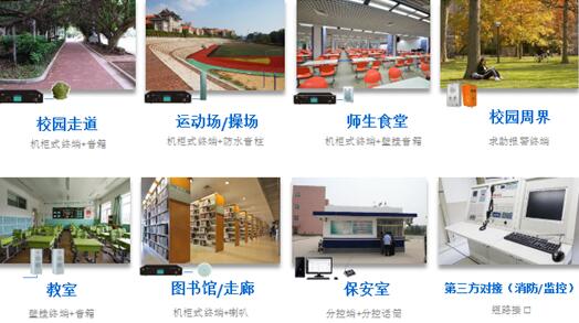 前端設備滿足校園公共區域播放、教室點對點控制、周界求助報警、保安室調度等廣播全覆蓋需求。