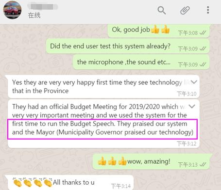 itc高質(zhì)量的產(chǎn)品及優(yōu)秀的服務(wù)得到了客戶及該市市長高度贊揚(yáng),為政府開啟大型會議奠定了堅(jiān)實(shí)的設(shè)備基礎(chǔ),感謝客戶對itc的選擇與支持,我們將再接再厲,以更好的產(chǎn)品和服務(wù)反饋給客戶。