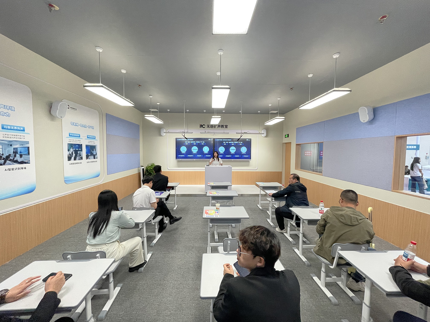 itc教室擴(kuò)聲系統(tǒng),采用AI大模型,智能識別環(huán)境聲場,利用自學(xué)習(xí)調(diào)節(jié)技術(shù),使環(huán)境達(dá)到最好的聲場狀態(tài),有效提升教學(xué)擴(kuò)聲質(zhì)量,同時(shí)自動(dòng)調(diào)試算法避免了安裝與運(yùn)維的復(fù)雜性。業(yè)內(nèi)首創(chuàng)運(yùn)用AI降噪消除非穩(wěn)態(tài)噪聲,相較于傳統(tǒng)降噪算法,能更好地濾除瞬態(tài)噪聲,包括拍手、開門、翻書等;AI語音檢測,為教學(xué)場景構(gòu)建零干擾的聲學(xué)基底;應(yīng)用多通道獨(dú)立自適應(yīng)反饋控制(AFC)擴(kuò)聲算法,多種調(diào)音模塊實(shí)現(xiàn)靈活聲學(xué)管控,克服聲學(xué)混沌,適應(yīng)更復(fù)雜環(huán)境。