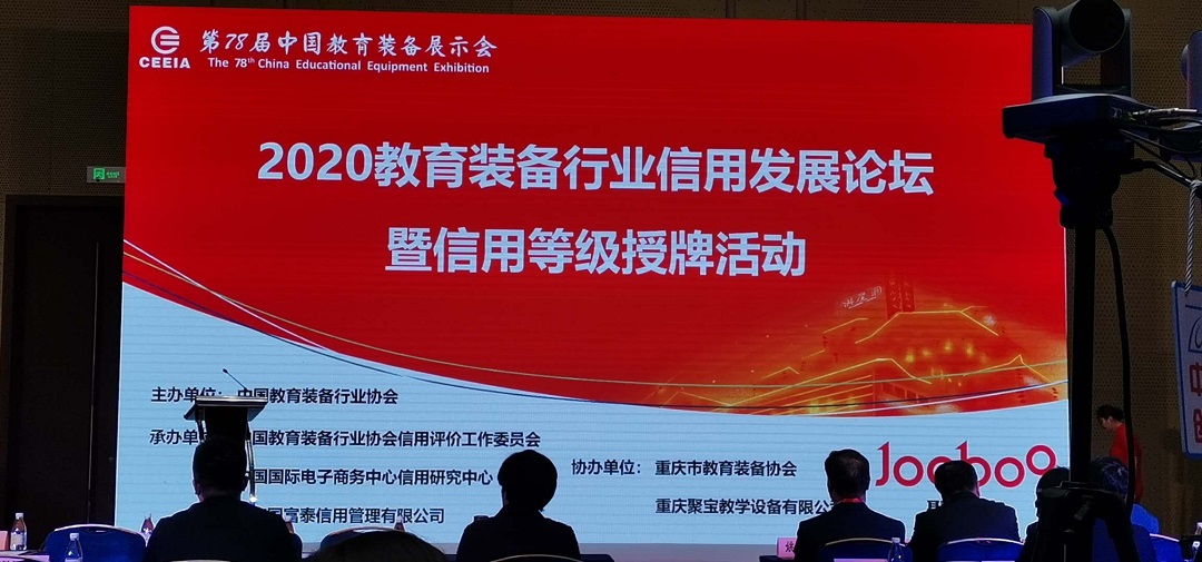 近日,2020教育裝備行業信用發展論壇暨信用等級授牌活動在重慶舉行。本次論壇活動由中國教育裝備行業協會主辦,中國教育裝備行業協會信用評價工作委員會、中國國際電子商務中心信用研究中心、北京國富泰信用管理有限公司承辦,重慶市教育裝備協會、重慶聚寶教學設備有限公司協辦。來自全國各地方教育裝備管理部門、行業協會、學校、研究機構及教育裝備企業代表300余人參加。