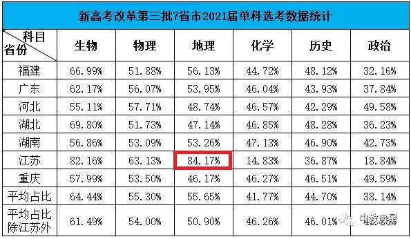 實行新高考改革方案的部分省市2021屆學生各科選考數(shù)據(jù),其中江蘇省最受歡迎的科目是地理,并且占比超過80%。