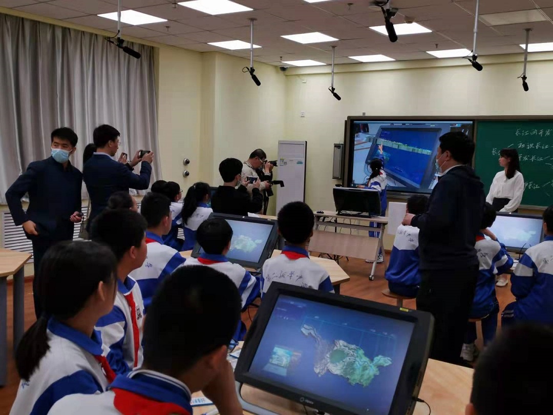 學校初中地理老師王藝涵為現場媒體演示了基于中教啟星研發的寰宇地理VR教學系統的“長江的保護和治理”課堂教學示例,引起媒體朋友的極大興趣與關注。