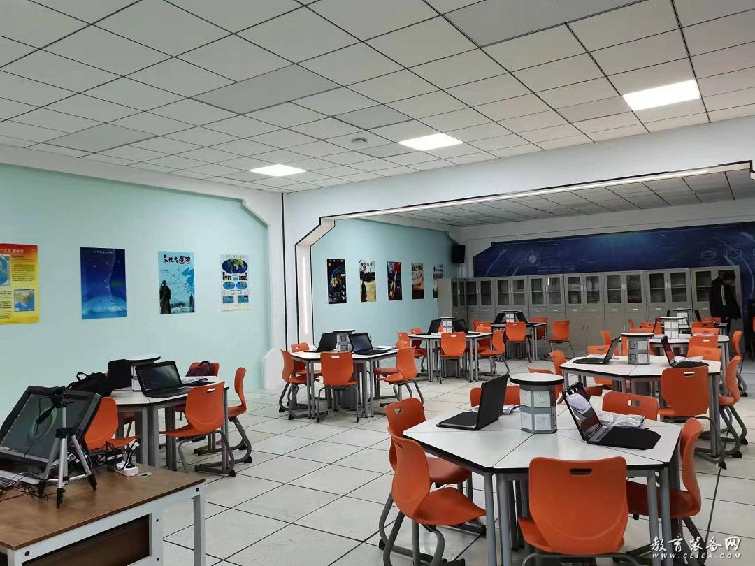 整間教室包括中教啟星VR一體機(教師機)及啟星VR移動課堂(學生端),配備大量高中地理、歷史、理化生等五個學科的VR教學資源。輔以極具虛擬現實特色的窗簾、背景墻和知識展板,整體現代風的環境設計十分引人注目。