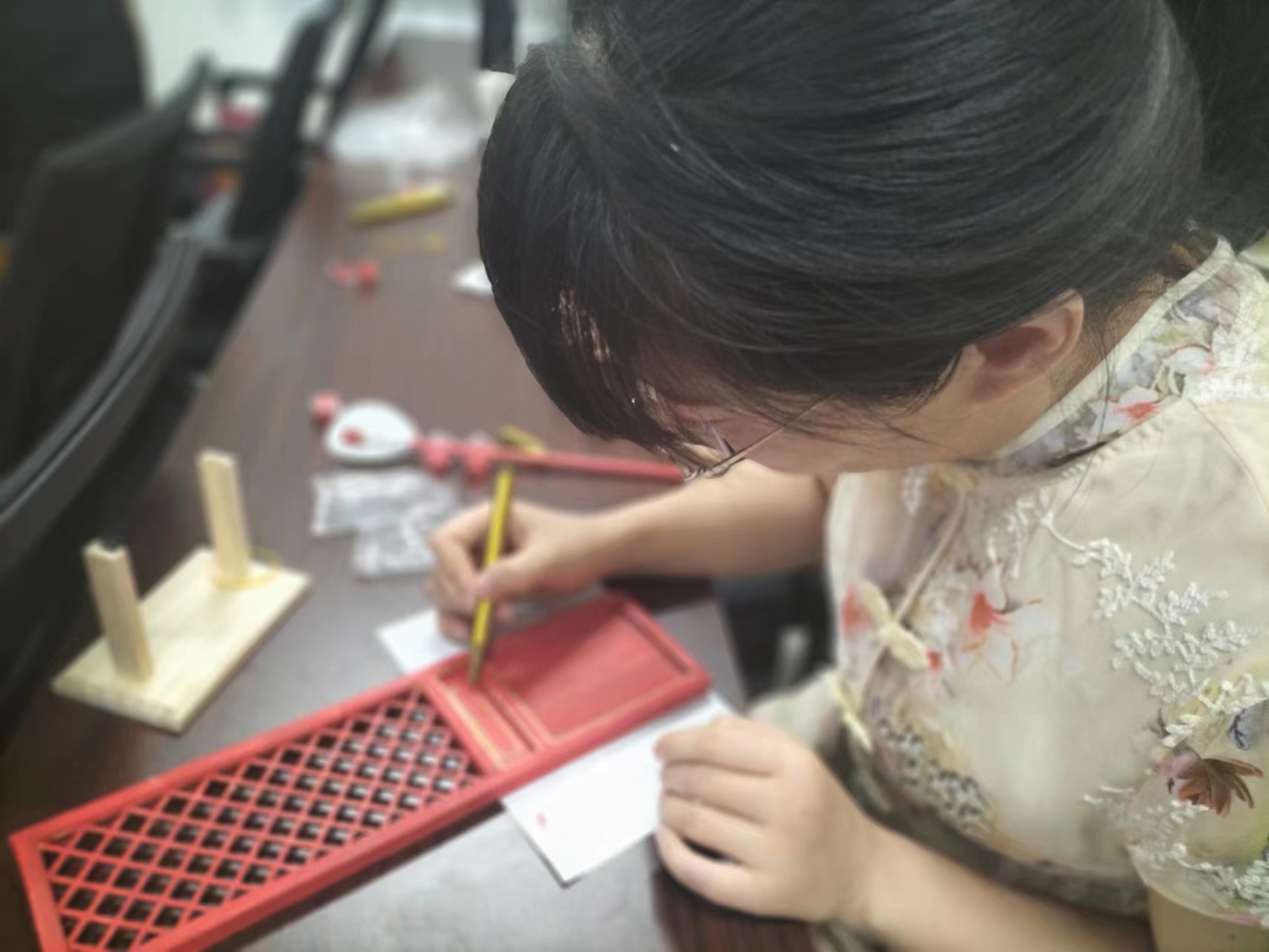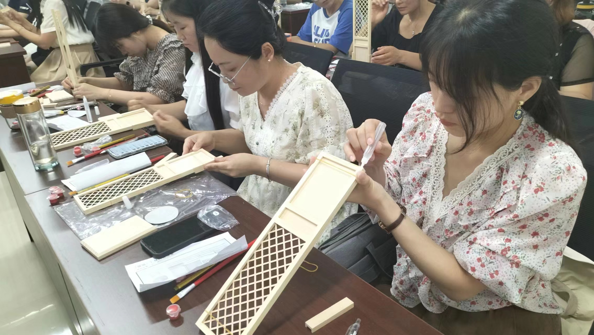 了解政策和實(shí)踐案例之后,教師們體驗(yàn)了一節(jié)實(shí)操課程——木作文化課程。在這個(gè)課程上,每位教師們都親手制作了一扇美麗的隔扇,并學(xué)習(xí)隔扇背后的文化內(nèi)涵。這不僅讓教師們深入了解傳統(tǒng)文化,也讓他們在創(chuàng)作中體驗(yàn)到了木作魅力。