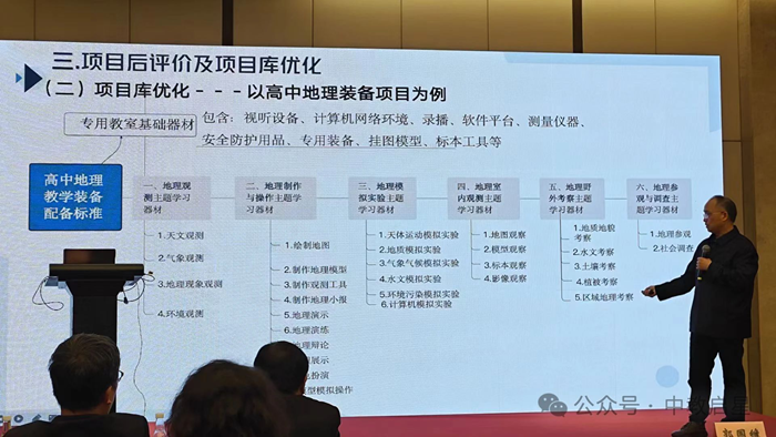 而項(xiàng)目庫優(yōu)化的案例則是以“高中地理裝備”為例,因?yàn)槟壳暗乩韺?shí)驗(yàn)裝備的發(fā)展相對理化生實(shí)驗(yàn)設(shè)備來說,有其獨(dú)特的學(xué)科特征和裝備普及階段。所以,他的建議是: