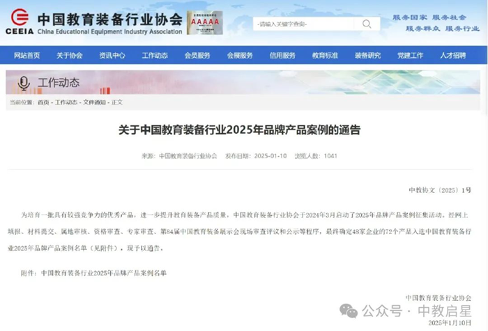 為培育一批具有較強競爭力的優秀產品,進一步提升教育裝備產品質量,中國教育裝備行業協會于2024年3月啟動了2025年品牌產品案例征集活動,得到了廣大會員單位的積極反饋。中教啟星響應號召積極參與活動,經過網上填報、材料提交、屬地審核、資格審查、專家審查、第84屆中國教育裝備展示會現場審查評議和公示等程序,VR科學教育、地理虛擬實驗教學系統兩個產品從數千產品中脫穎而出,入選中國教育裝備行業2025年品牌產品案例名單。與此同時,中教啟星教育裝備產品連續多年獲得中國教育裝備行業協會優秀產品推薦。