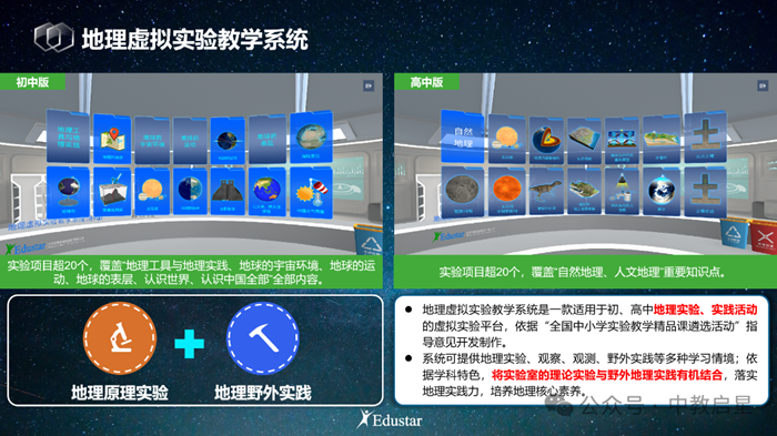 中教啟星VR科學教育以VR技術+科學教育為核心,切實有效助力教育資源優質均衡為宗旨,面向教學應用三大場景,打造三大模式全方位助力學校開齊開足開好國家課程標準規定科學實驗課程。