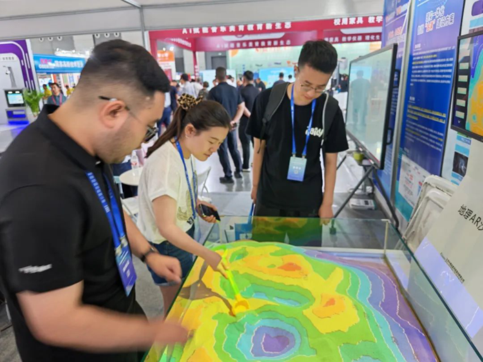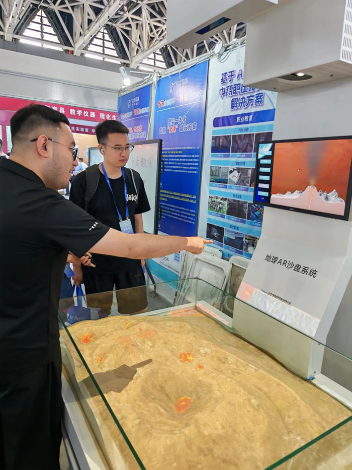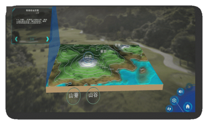 地理 AR 沙盤則是另一大亮點,通過先進的 AR 增強現實與傳感技術,學生只需輕輕操作沙盤,即可實時看到地形地貌的動態變化,同步理解相關等高線地形圖的平面轉化,直觀感受等高線、火山噴發、分層設色地形圖等抽象地理概念,讓學習變得更加生動有趣。