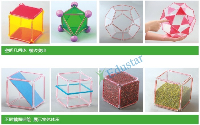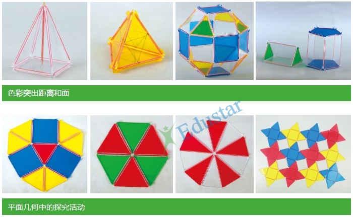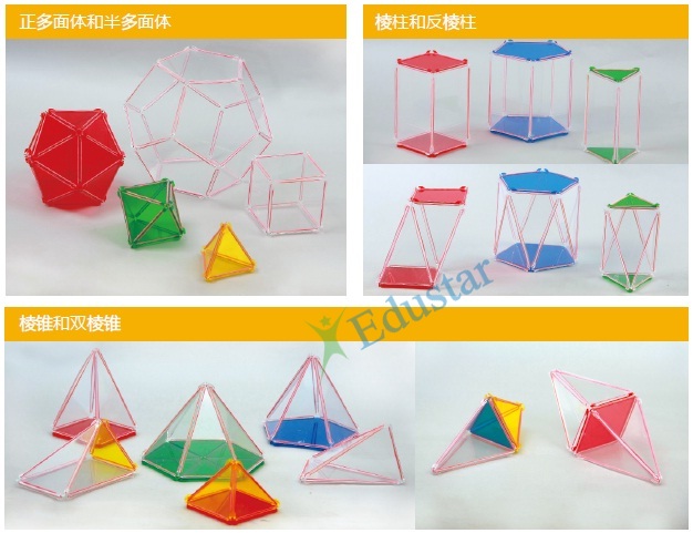 搭建套裝內(nèi)含286塊標(biāo)準(zhǔn)化組件,其中等邊三角形100片、等腰三角形60片、正方形60片、長方形30片、五邊形36片,橡皮筋600根。套裝可以構(gòu)建起正多面體、棱柱和反棱柱、棱錐和雙棱錐、棱臺以及組合體等多種立體幾何體模型,是一套獨一無二且極具價值的學(xué)習(xí)工具,可以最大限度激發(fā)學(xué)生的創(chuàng)造性,幫助學(xué)生建立空間意識,培養(yǎng)學(xué)生的空間想象力,達(dá)到教學(xué)目標(biāo)。