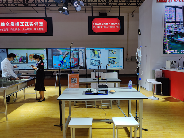 現場最吸睛的莫過于是實訓5G無線全錄播系統展區了,來往的觀眾紛紛舉起了手機拍攝系統運行的過程,精心布置的展區現場直觀展示了全錄播系統與繪畫、烹飪、醫護、電子雕刻等不同職教場景的高度融合。