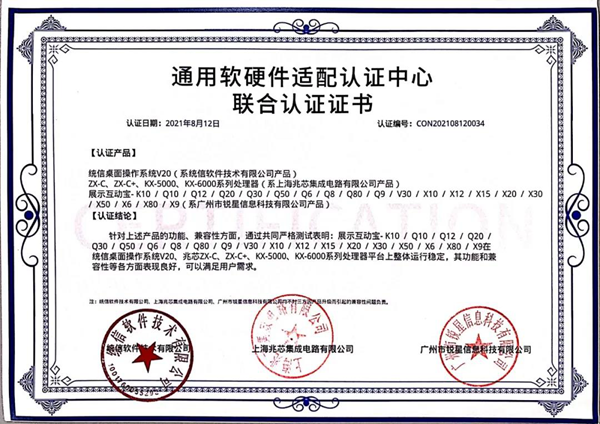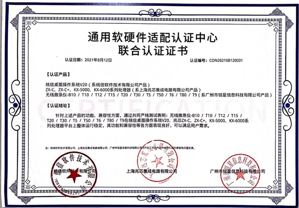 兆芯認證證書(展示互動寶、無線微錄儀)