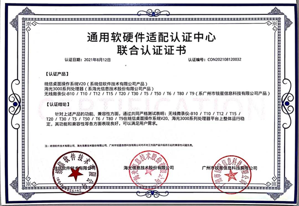 海光認證證書(展示互動寶、無線微錄儀)