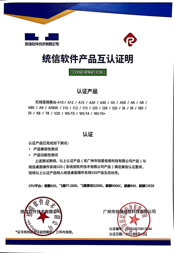 統信認證證書(無線視頻展臺、視頻采集終端)