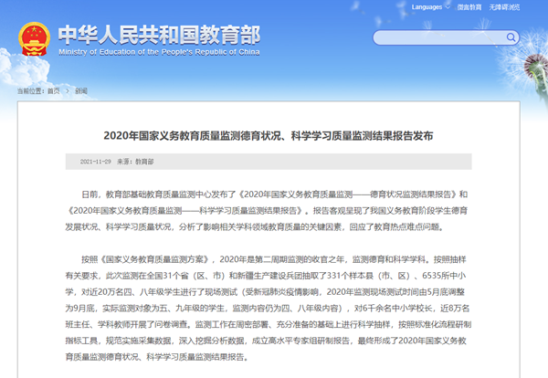 日前,教育部基礎教育質量監測中心發布了《2020年國家義務教育質量監測——德育狀況監測結果報告》和《2020年國家義務教育質量監測——科學學習質量監測結果報告》。
