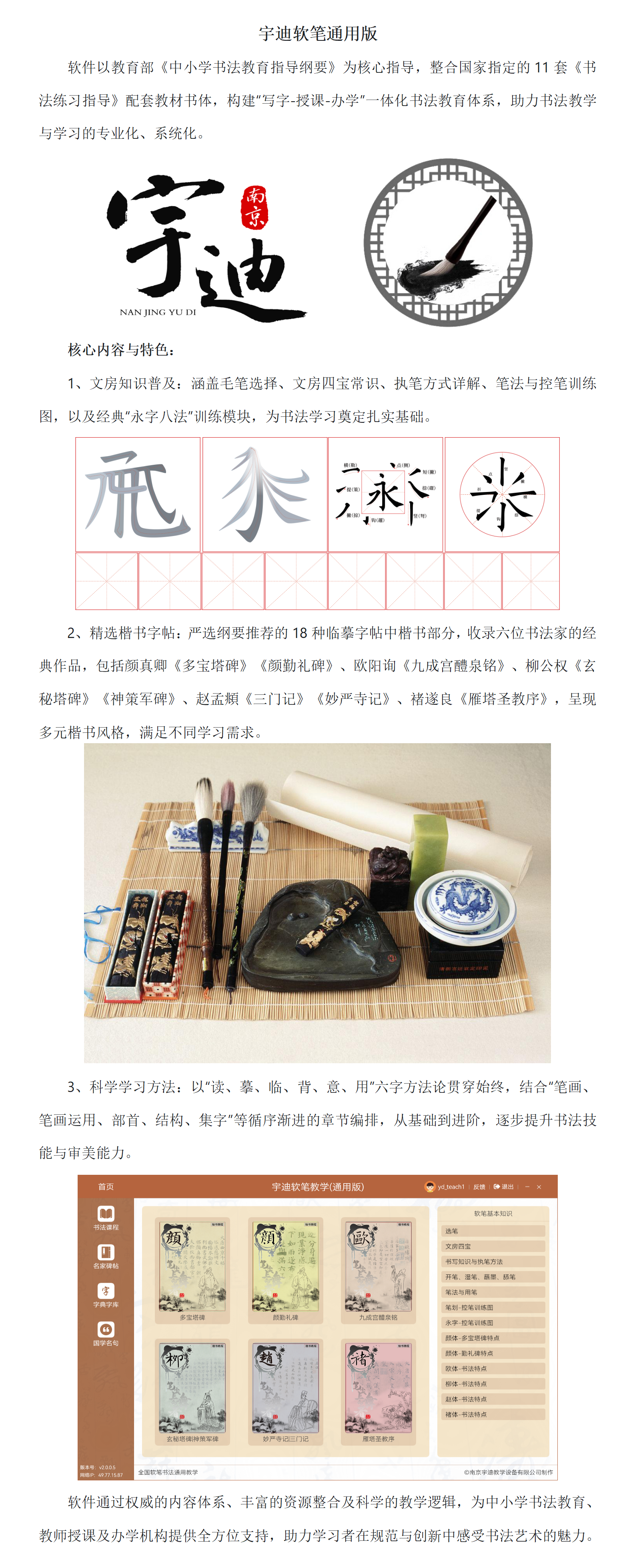 南京宇迪教學設備有限公司、開發研制數字書法教學系統、數字書法教室、智云數字書法教室,智慧教室,智慧教學系統、智慧管理系統,全自動錄播系統,教學行為分析系統,擁有自主開發的系列產品,涉及中國傳統文化書畫教室、老師成長和提升的教研產品、增賦減負備授課工具、提升優質資源均衡的結對課堂、南京宇迪智慧數字硬筆書法設備、南京宇迪智慧數字化軟筆筆書法設備、南京宇迪智慧數字化學生教室配套設備、南京宇數字化教育設備