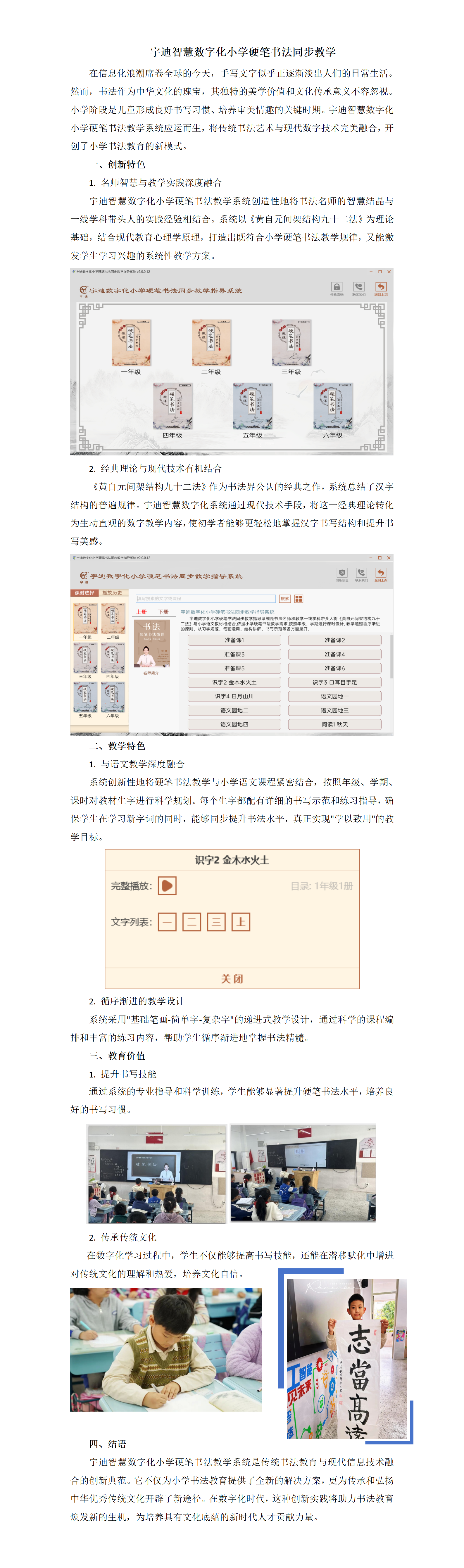 | 南京宇迪教學設(shè)備有限公司、開發(fā)研制數(shù)字書法教學系統(tǒng)、數(shù)字書法教室、智云數(shù)字書法教室,智慧教室,智慧教學系統(tǒng)、智慧管理系統(tǒng),全自動錄播系統(tǒng),教學行為分析系統(tǒng),擁有自主開發(fā)的系列產(chǎn)品,涉及中國傳統(tǒng)文化書畫教室、老師成長和提升的教研產(chǎn)品、增賦減負備授課工具、提升優(yōu)質(zhì)資源均衡的結(jié)對課堂、南京宇迪智慧數(shù)字硬筆書法設(shè)備、南京宇迪智慧數(shù)字化軟筆筆書法設(shè)備、南京宇迪智慧數(shù)字化學生教室配套設(shè)備、南京宇數(shù)字化教育設(shè)備 |